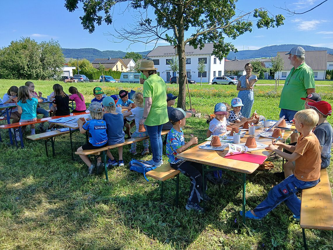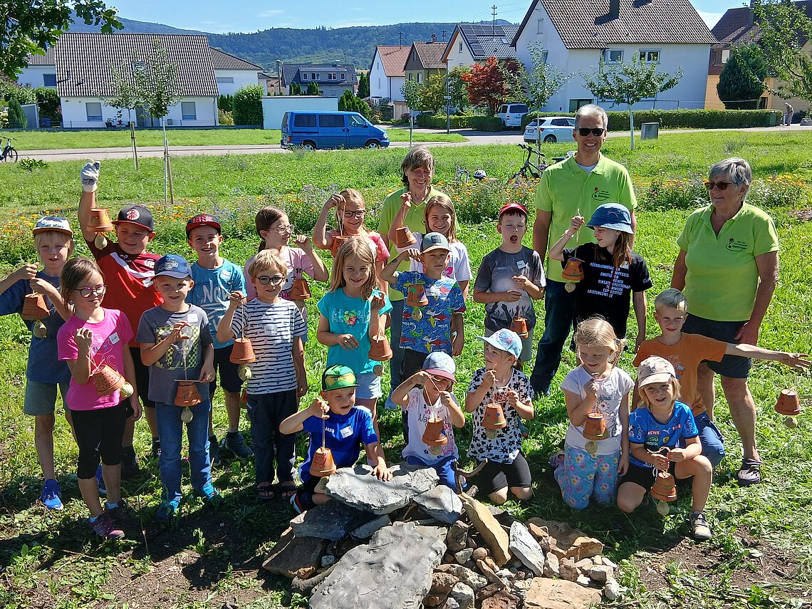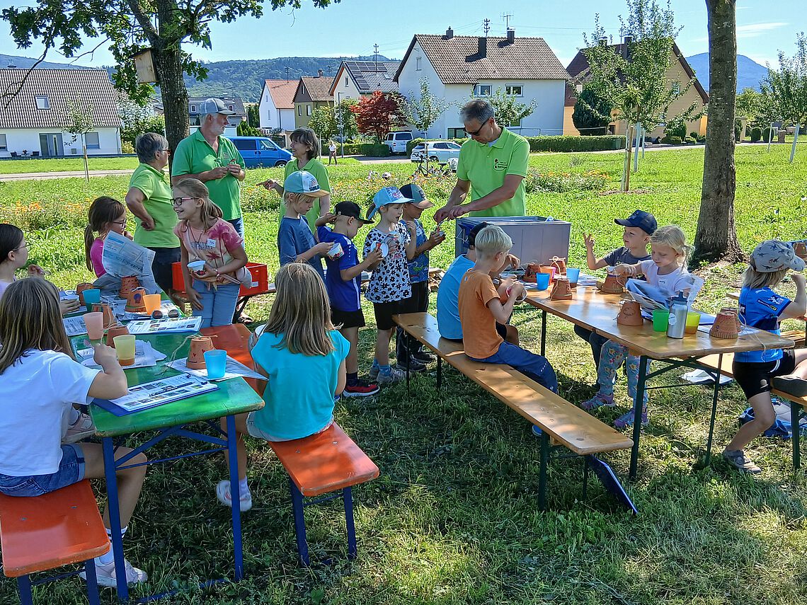 Auf ein Kies- und Schotterbett schichteten die Kinder Zweige. Dann wurden die Hohlräume mit kleinen Steinen verfüllt und abschließend große Steine aus der Mayerschen Steine-Sammlung aufgeschichtet. Zum Kernprogramm gehörte aber auch wieder das Kennenlernen von Obstbäumen, Wiesenblumen und Tieren auf einer Streuobstwiese mittels eines Rätsels und damit der ökologischen Bedeutung als wichtiges Rückzugsgebiet für viele Pflanzen und Tiere. Nachdem im vergangenen Jahr Nistkästen für verschieden Vogelarten angebracht worden waren, bastelten die Kinder nun für den heimischen Garten oder Balkon Futterglocken. Tontöpfe wurden phantasievoll bemalt und dann ein Futterknödel eingehängt. Leckeres Eis aus Eigenproduktion und Streuobstwiesenapfelsaft waren eine willkommene Erfrischung für die Kinder und das OGV-Team.