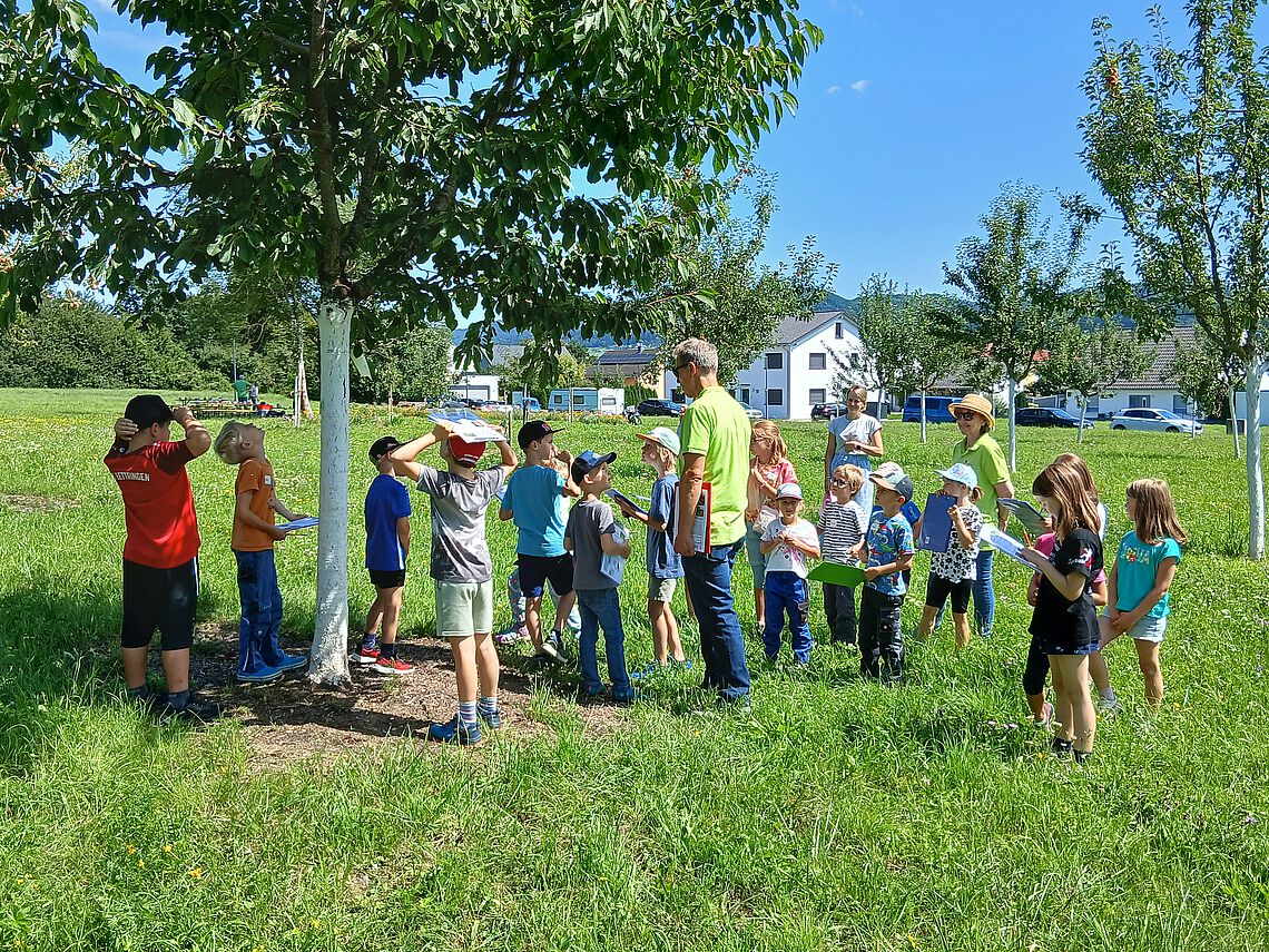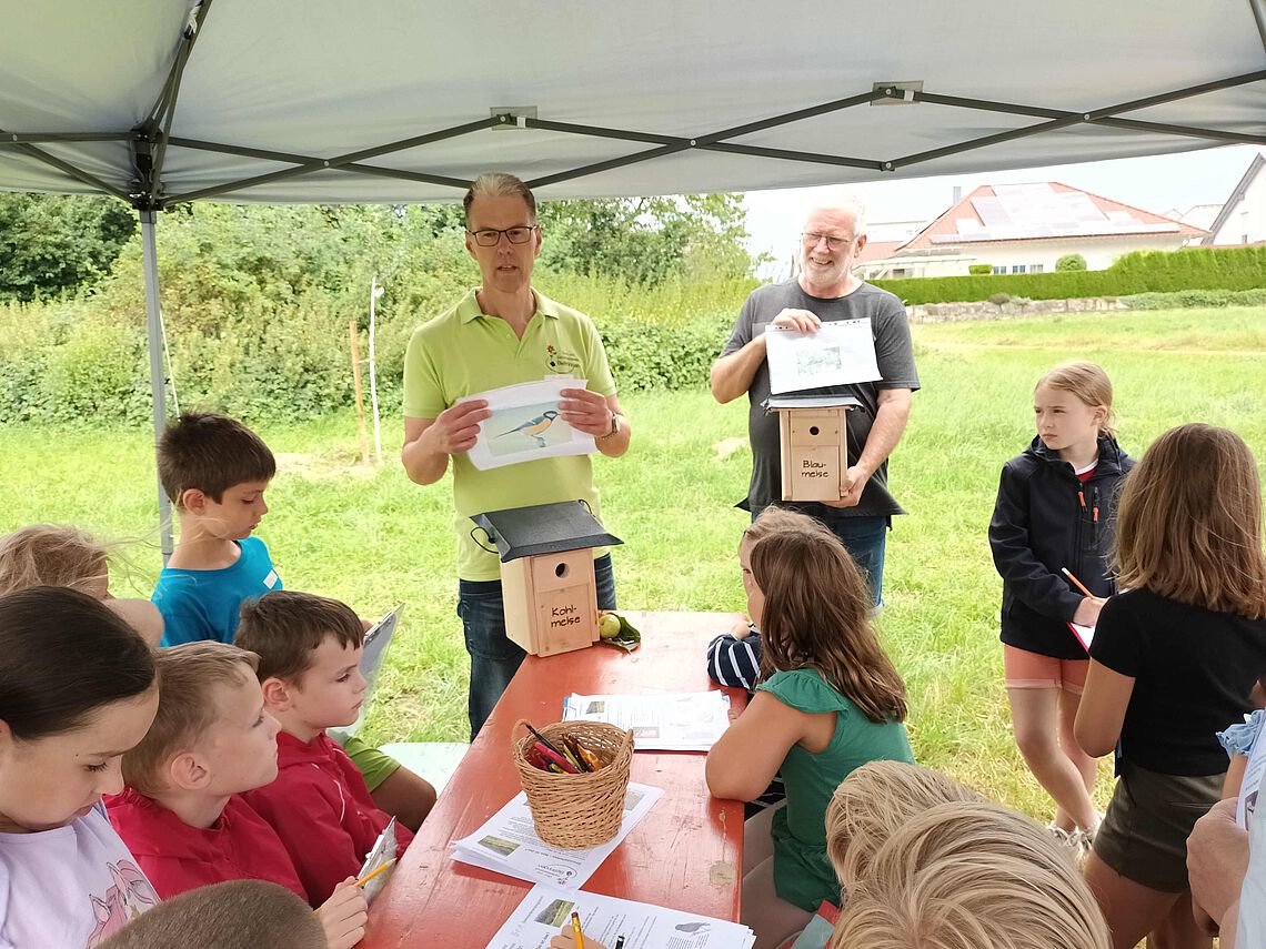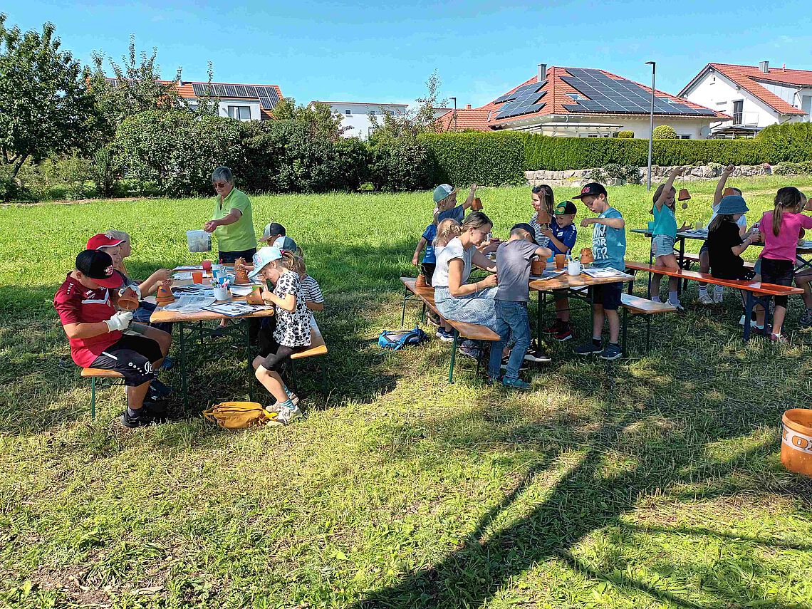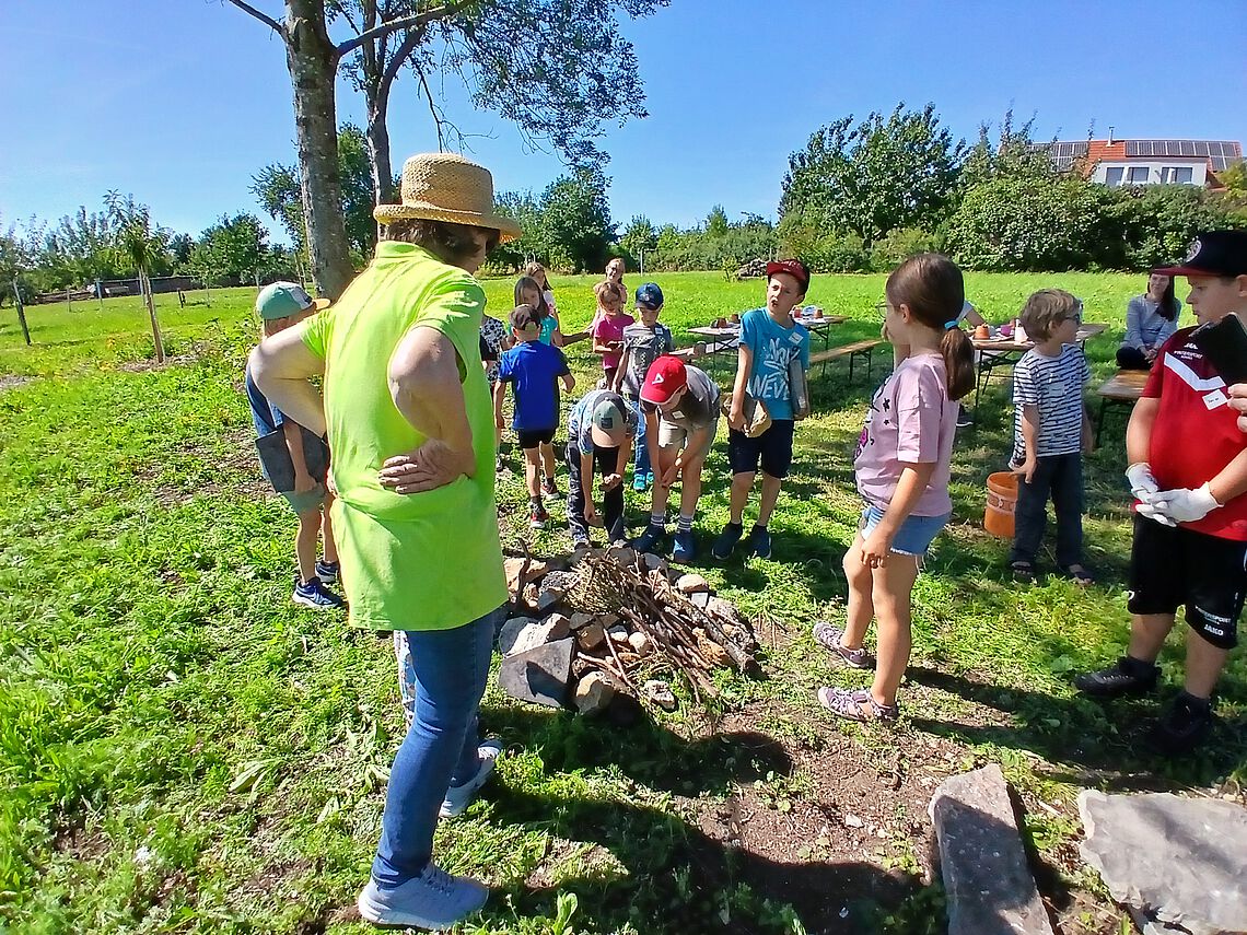 Auf ein Kies- und Schotterbett schichteten die Kinder Zweige. Dann wurden die Hohlräume mit kleinen Steinen verfüllt und abschließend große Steine aus der Mayerschen Steine-Sammlung aufgeschichtet. Zum Kernprogramm gehörte aber auch wieder das Kennenlernen von Obstbäumen, Wiesenblumen und Tieren auf einer Streuobstwiese mittels eines Rätsels und damit der ökologischen Bedeutung als wichtiges Rückzugsgebiet für viele Pflanzen und Tiere. Nachdem im vergangenen Jahr Nistkästen für verschieden Vogelarten angebracht worden waren, bastelten die Kinder nun für den heimischen Garten oder Balkon Futterglocken. Tontöpfe wurden phantasievoll bemalt und dann ein Futterknödel eingehängt. Leckeres Eis aus Eigenproduktion und Streuobstwiesenapfelsaft waren eine willkommene Erfrischung für die Kinder und das OGV-Team.