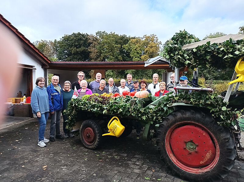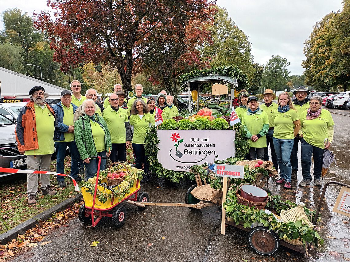 Viele Vereinsmitglieder waren beim Beitrag des OGV zum Festumzug 125-Jahre Musikverein beteiligt: Ein Festwagen mit Mostpresse, geschmückt mit Herbstastern, verschiedenen Gemüsen, Äpfeln, Weintrauben, Efeugirlanden und bunten informativen Stoff-Foto-Postern. OGV-Mitglieder schenkten den frischgepressten Most aus. Den Abschluss bildeten „Leiterwägele“ aus verschiedenen Jahrzehnten.