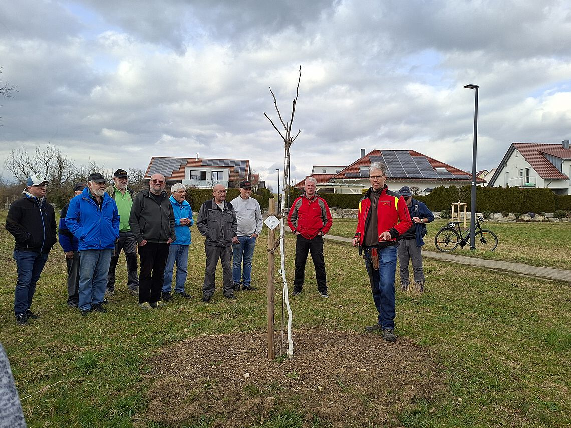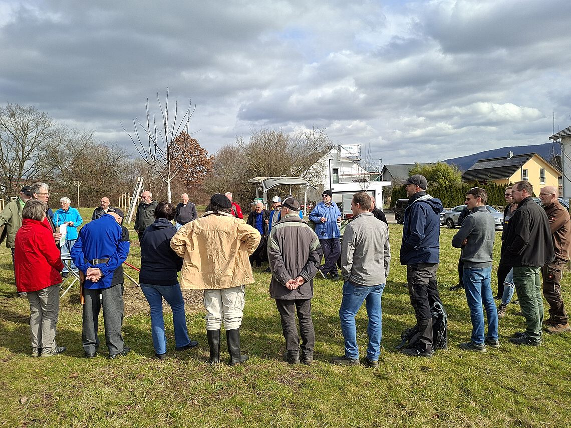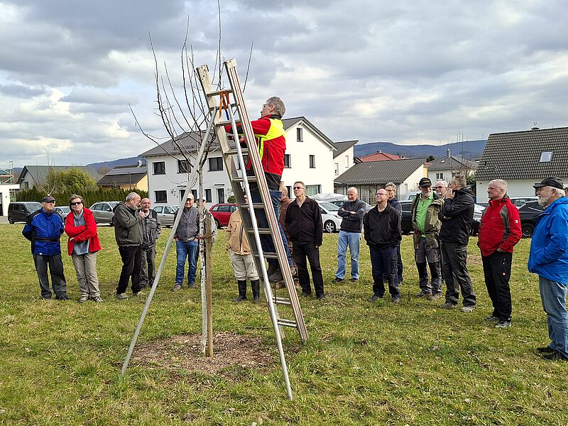 Auf der Baumwiese am Amselweg hatte die Stadtverwaltung als Ausgleichsmaßnahme für die aktuelle Rodungsaktion zum Bau der Mehrfamilienhäuser an der Güglingstraße 15 mehrjährige Obstbaumhochstämme durch eine Fremdfirma pflanzen lassen. Diese hatten allesamt einen Erziehungsschnitt nötig. Daneben befinden sich auf dem Grundstück mehrere Reihen von über 10 Jahren alten Obstbäumen sowie einige Walnuss- und Maronenbäume, die in den letzten Jahren gepflanzt wurden. Somit konnte Suitbert Geiger den Teilnehmern an zahlreichen Demonstrationsobjekten in unterschiedlichen Entwicklungsstadien die grundlegenden Schnittmaßnahmen vorführen.